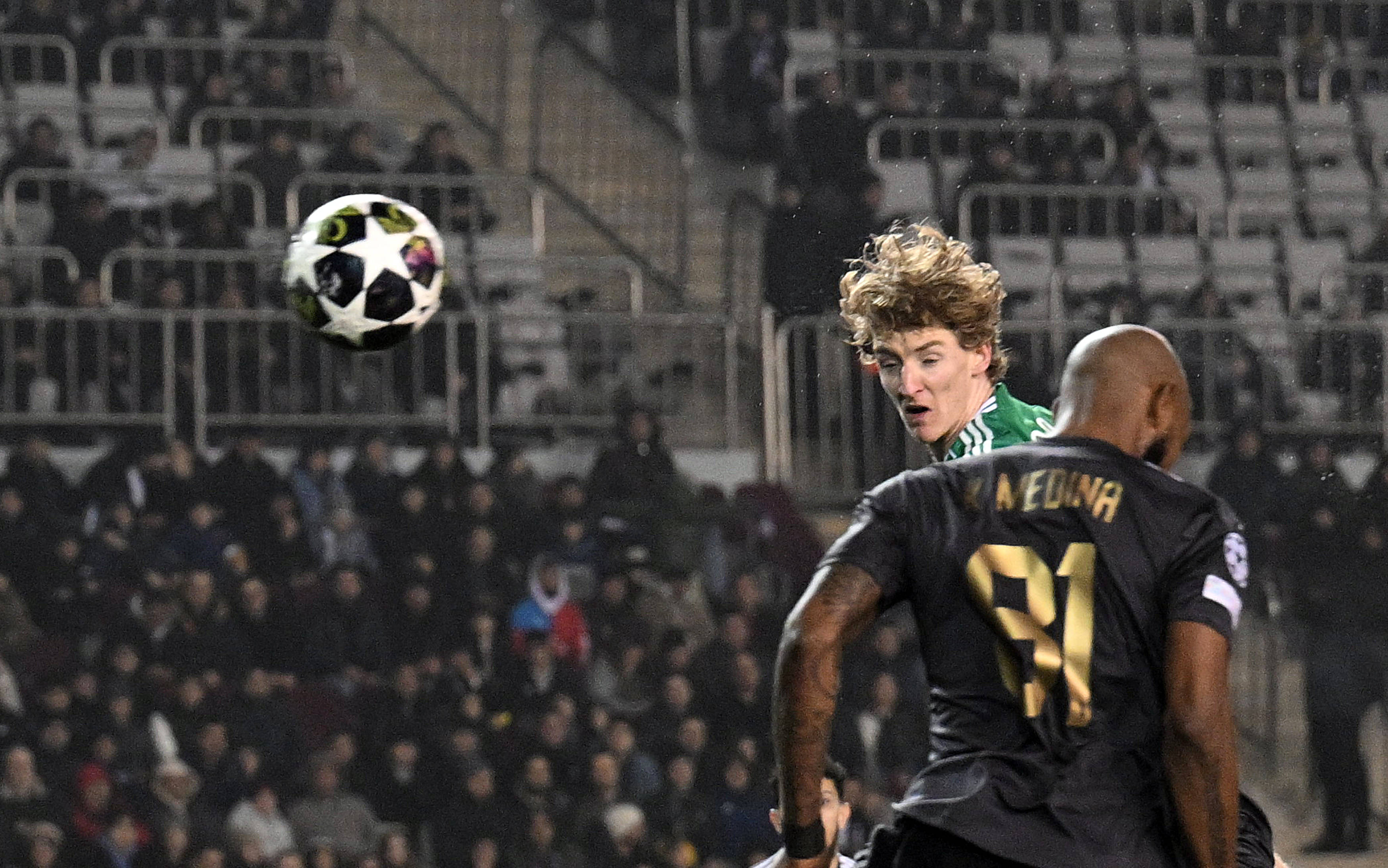 2月18日,纽卡斯尔联队球员埃兰加(左)同卡拉巴赫队球员比卡略在比赛中拼抢。 新华社发(巴巴耶夫摄)